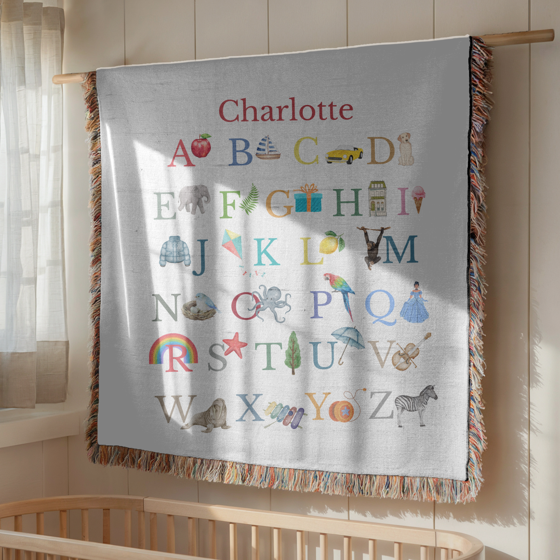 A charming, personalized ABC woven blanket filled with colorful illustrations—perfect for snuggles, playtime, and early learning.
