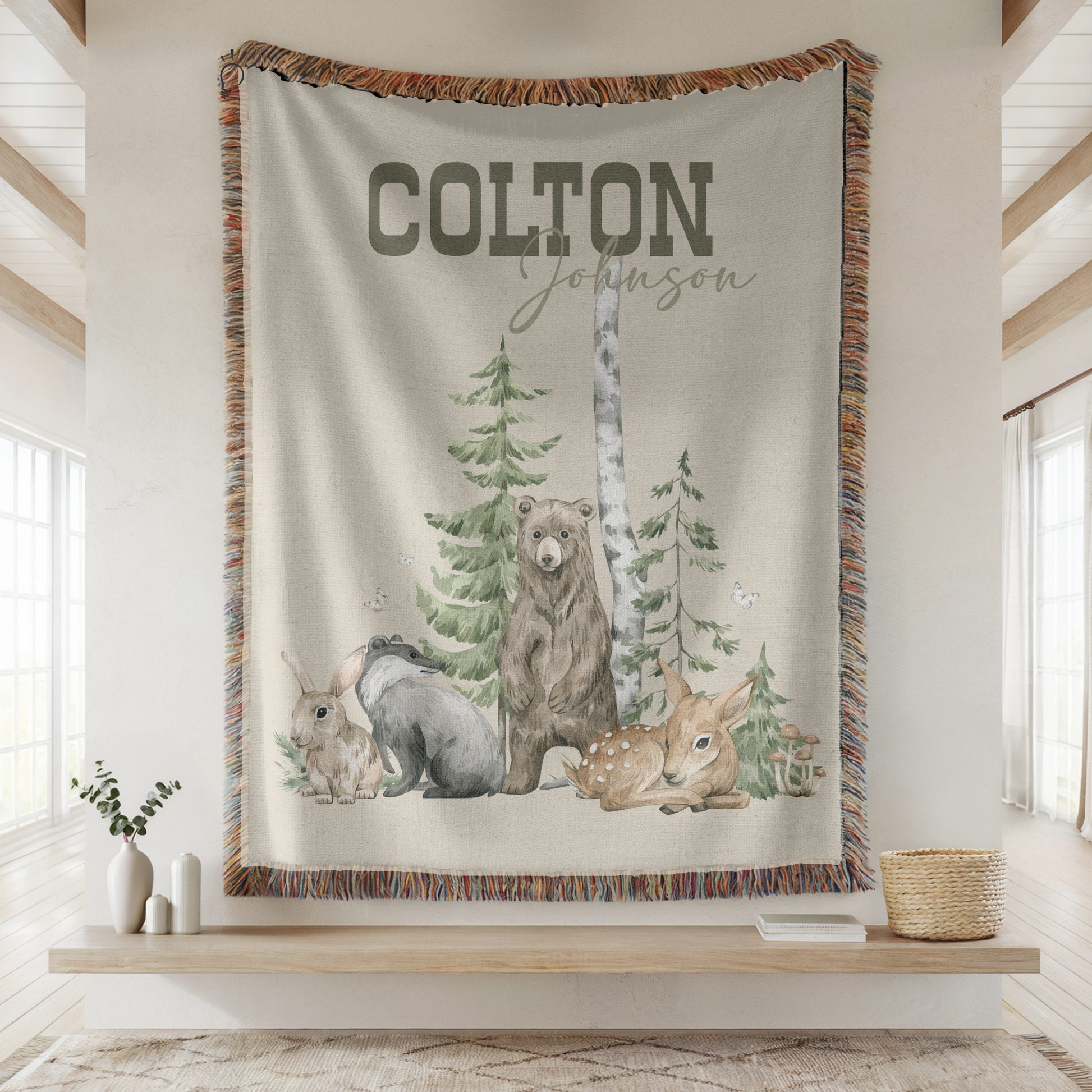 Personalized Woodland Baby Blanket: Cotton Woven Forest Animals Name Blanket